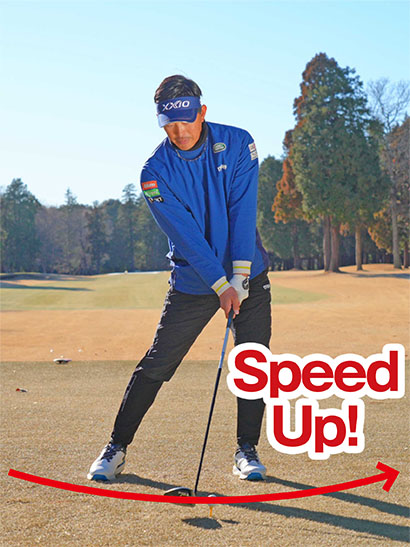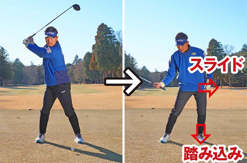 左腰をスライドさせると同時に左足をしっかり踏み込むことが大事ですから、下半身リードができない人は切り返しで左腰を目標方向にグイッと押していくくらいのイメージがいいと思います。