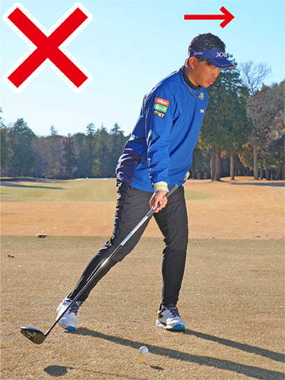 トップの位置から腰が左に移動せず、その場で回転してしまうと胸や肩が早く開いてしまうわけですが、体重を左足に早く乗せようとして上体が目標に流れてしまうのはNGです。