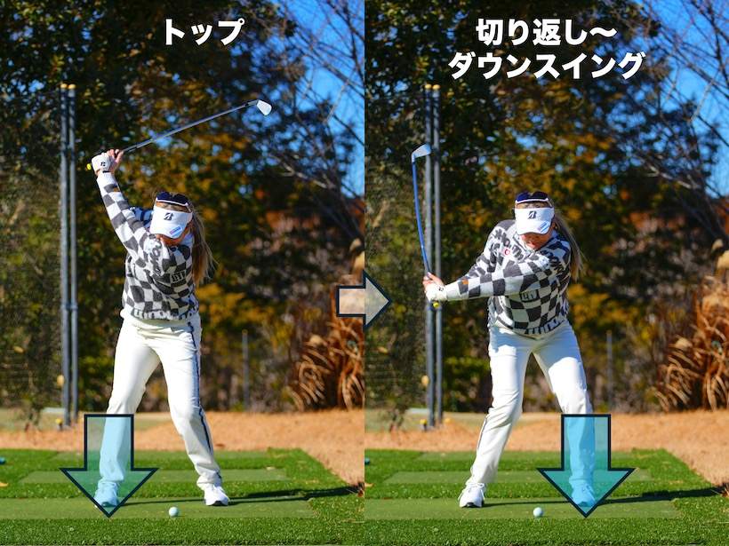 アイアンショットの精度を上げたいなら、見本とすべきはショットメーカーとして知られる桑木志帆選手のスイングだ。注目すべきは、スイング中に「テークバックからトップ」と「インパクト直前」の2度、右足を踏ん張っている点。