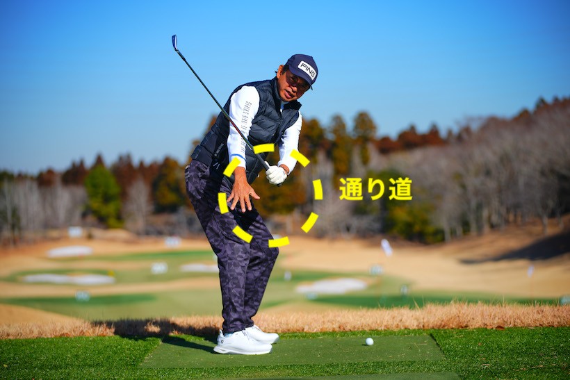ベタ足のいいところはダウンスイングで右足が出てこずに手元の通り道ができるところです。右足カカトが地面に着いていることで、腰が浮かずに正しい軌道で打てるのんです。
