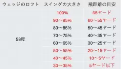 下の2つの表の中で赤字で示しているのは、半端な距離に対応するためのクラブセレクトの一例です。85~80ヤードは50度、75~70ヤードは54度、65~55ヤードは58度、50~25ヤードは54度、それ以下は主に58度を使用するという意味です。
