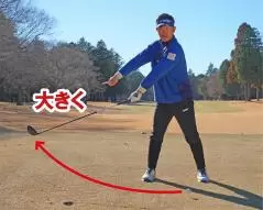 クラブヘッドで大きな円弧を描くつもりでテークバックを始動し、左手を左足から遠ざけるイメージで上げていくのが大事なポイントです。