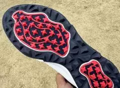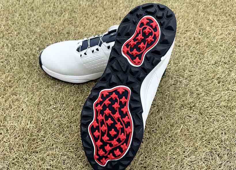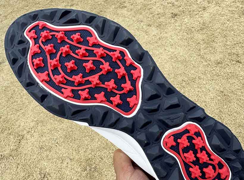 このシューズはスパイクレスシューズなのですが、アウトソールの内側(赤い部分)には軽量と耐摩耗性を両立した硬い素材であるポリウレタン樹脂を採用。スイング時には全方向へのグリップ力を発揮します。