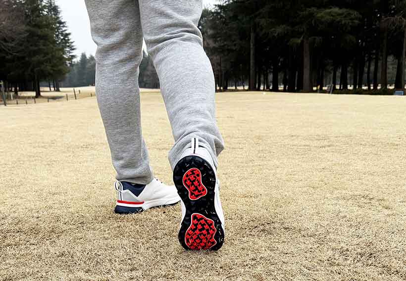 そして少し驚いたのがグリップ力。スイングしていても足がしっかりと地面を掴んでくれるんです。斜面からのショットでも滑りそうな感覚は全くないし、斜面を歩いていても不安が全くありません。最近のスパイクレスシューズはかなり出来がいいのはわかっているのですが、このシューズはその中でもトップクラスのグリップ力と言ってもいいと思います。