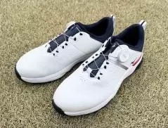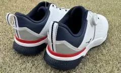 スイングしてみましたが、柔らかいシューズってたまに安定感が足りないものがあるのですが、このシューズはそんなことがない。足へのフィット感が高いので、シューズの中で足が動いてしまうようなことがないので、ショット時にもしっかりと地面を蹴れます。