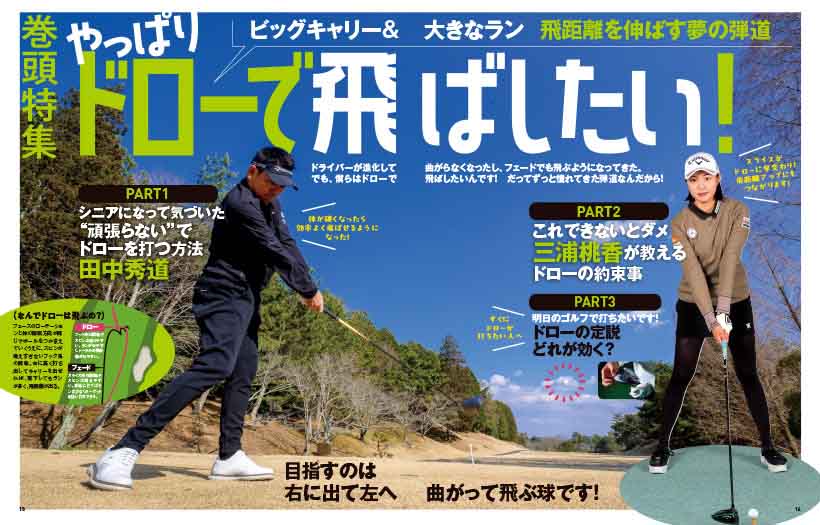 ドライバーでより遠くに飛ばせる弾道といえば、今も昔も変わらず「ドローボール」。このアマチュアゴルファー憧れの弾道はどうやったら打てるようになるのか? 近頃スランプを脱した、ドローの使い手として名高い田中秀道プロに、自身の経験に基づいた「最新ドローの打ち方」をじっくりと教えてもらいました。彼がシニアになって気づいた体にやさしいドローの打ち方とは? さらに三浦桃香プロがレッスン活動の現場から気づいたアマチュアにピッタリな「ドローを打つための基本」をアドレスからフィニッシュまで詳しくレッスン!読むだけで夢の弾道が手に入ります。