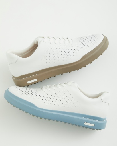 新作モデルをベースにしたシューズは、ミッドソールにユナイテッドアローズ ゴルフのシーズナルカラーであるダスティブルーを採用。ヘッドウェアは、ライムグリーンをキーカラーに両ブランドロゴをデザイン。