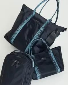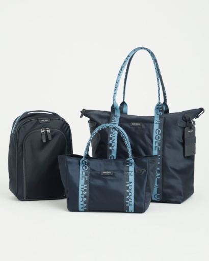 光沢のあるナイロン素材を使用したカートバッグで、持ち手やポケット上部に両ブランドのロゴを配したデザインが特徴。別売りのIDホルダーを掛けられるレザーループ付き。