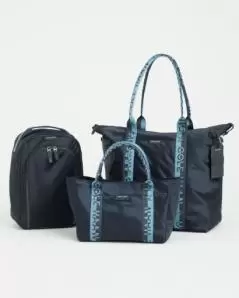 光沢のあるナイロン素材を使用したトートバッグ。複数の内側ポケットやウォーターボトルやシューズを収納できる外側のサイドスリップポケットを備えてい流。持ち手やポケット上部に両ブランドのロゴを配したデザインが特徴で、別売りのIDホルダーを掛けられるレザーループ付き。