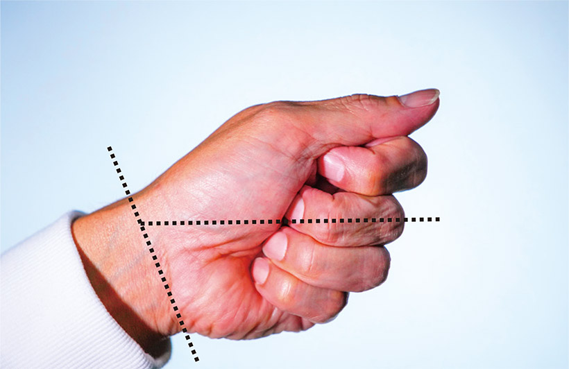 清永 次に第1指と第2指で左手の場合と同じく、母指球を構築します。右母指末節骨と第2指基節骨との間がV字になるようにするのも同じです。それから右母指球の手掌の線(生命線)を左の母指の上に乗せるようにし、右手関節線と左母指基節骨根元が同じ位置関係を保つようにしてください。そして最終段階のチェックも左手と同じで、「右親指の中心がグリップの真上よりもやや左側を指すこと」。また、「親指の爪先が第2指の曲がっているPIP 関節部よりも手元側にあること」。「右母指の腹はグリップの上に軽く乗せている感じであること」。