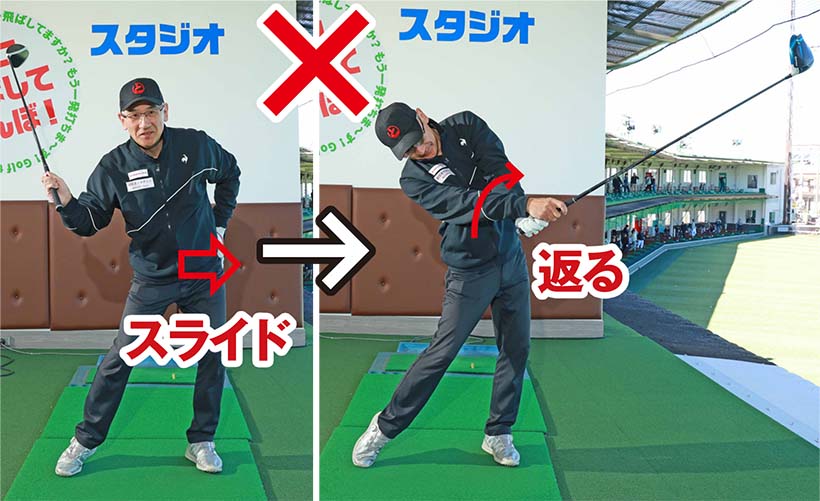 切り返すときに左足を踏み込んで腰を左にスライドするのは間違いではありませんが、左腰が目標方向に動きすぎると腰の回転がそこで止まってしまい、両手が急激に返ってフェースがかぶって当たるのです。