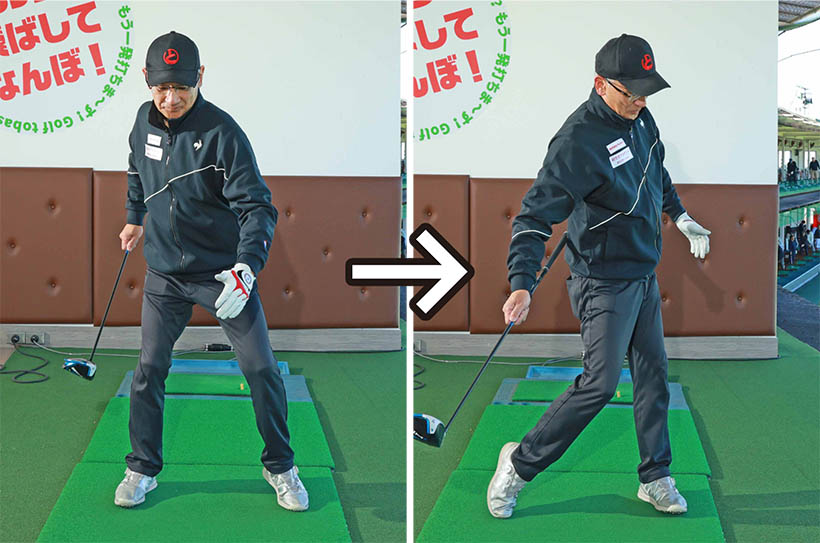 わかりやすくいえば足踏みの要領です。アドレスでは両足の土踏まずに体重を乗せます。バックスイングではカラダの回転に連動して左足はツマ先側に、右足はカカト側に体重が移動します。そしてダウンスイングでは左足はカカト側に、右足はツマ先側に移動することで腰がスムーズに回転します。