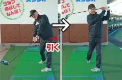 症状が違えば原因も修正法も当然違ってきます。どうしてチーピンが出てしまうかというと、ダウンスイングの始動で左腰を目標方向にスライドしているからです。