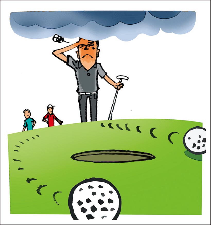 パットが入らなくなった人たちの頭の中には「入らない」という結果しかなくて、「どんな具合に外れたの?」と訊ねても右に外れたのか、左に外れたのかが案外わかっていません。強すぎて入らなかったのか、弱すぎてカップに届かなったのか、それすらもほとんど記憶に残っていないわけです。