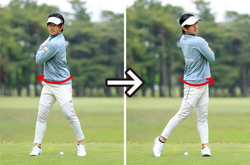 腕や手への依存度の少ないトランクローテーション型のスイングの場合は、アドレス時の両肩と両腕の三角形をしっかりキープしつつ、背筋や腹筋を絞るイメージでカラダを回転します。