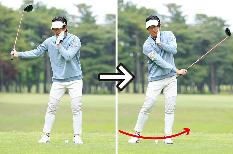 軸ブレをなくすことでアームローテーション主体のスイングのメリットが活きて飛距離アップに直結します。