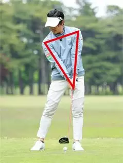 両ヒジを下に向けて両ワキをほどよく締めた体勢でアドレスし、手首とヒジを柔らかく使ってスイングしましょう。そうすれば両肩と両腕の三角形が大きく崩れてしまうことがなく、しかも腕がしなやかに使えてアームローテーション主体でスイングできるようになります。
