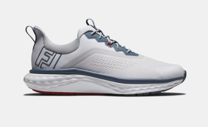 今回試した「FJ クオンタム」のカラーはホワイト/ブルー。シンプルなホワイトベースに、ブルーとレッドの差し色が入ったデザインです。カラーはこのホワイト/ブルーのほかにホワイト/グレー、ブラック/ホワイト、グレー/ホワイトの3色もあります。