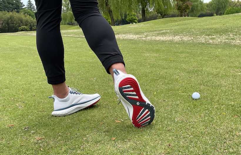 スイング時に足元がズレることもなく、安心して振り切れました。歩行中も屈曲性が高く、ソール全体がスムーズに曲がってくれるので、足運びが非常に楽です。