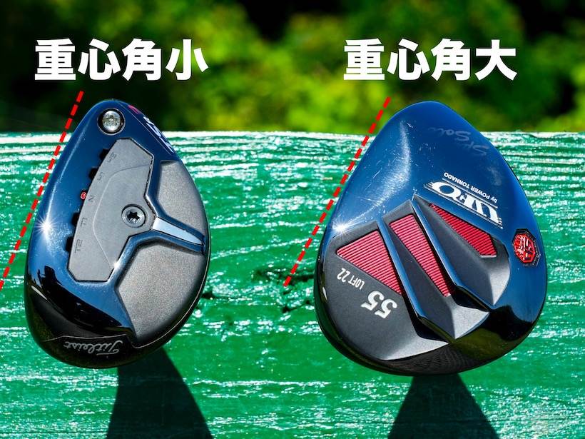 シャフトを手のひら、もしくは台の上に乗せて、ヘッドを台の外にブラ下げた時にフェースが上を向く度合いが重心角。フェースが上を向く度合いが大きいほど、重心角も大きくなります。そして、重心角が大きいほど、インパクトゾーンでフェースが自然と返る動きが大きくなるので球がつかまりやすくなります。
