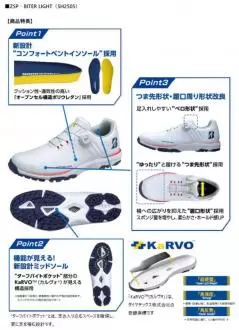 グリップ性能についても、前モデルを継承した「ターフバイトポケット」をアウトソールに搭載し、芝の入り込むスペースを確保することにより、高いグリップ性能を発揮。さらに、日本人の足にフィットしやすいオリジナル3Eラストを採用し、つま先をゆったりさせるアッパー設計により、快適なラウンドをサポートしてくれる。