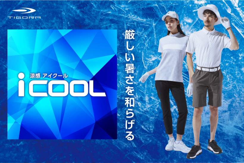 春夏のプレーを快適に楽しむために開発された、機能性に特化したゴルフウェアライン。人体から発せられる水分に反応し、熱を吸収・放出する“アイクール素材”を使用。さらに素材自体にも遮熱効果を備え、当社従来品と比較して-2℃の涼しさを実現した。