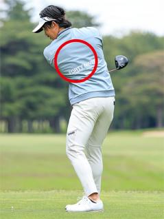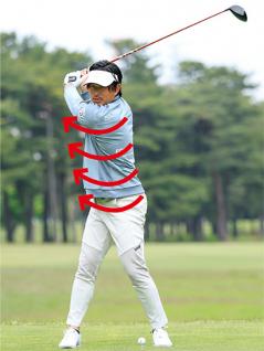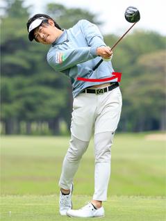 お腹を回すイメージがオススメ。肩と腰の回転角度が大きくなって飛ばせる!