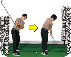 左手で右ヒジを支える素振りに慣れてきたら、同じように左手で右ヒジを支えながら実際に球を打ってみましょう。トップは小さく、距離はアプローチ程度でOK。クラブをインサイドから出せることを確認しつつ、球を真っすぐに飛ばしてみましょう。
