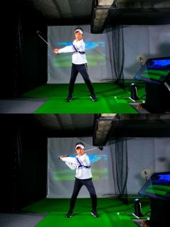 「右ヒザを伸ばしてクラブを上げていったら、フォロー側でも同じように左ヒザを伸ばしていきたいですね。バックスイングとフォローでちょうで反転しているイメージです。バックスイングでは右足カカト、フォローでは左足カカト、そうイメージして振ってください。そうすれば自然と腰のターンが入るようになりますよ」(内海プロ)