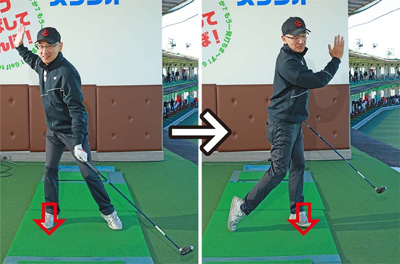 フェアウェイウッドの苦手意識が強い人ほど下半身が止まって手打ちになりやすいですから、「トップで右足、フィニッシュで左足」を意識し、足踏みの要領で体重移動を使ってスイングしましょう。