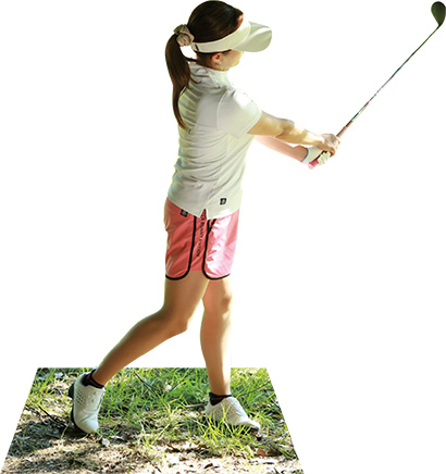 クラブを高い位置に振り抜くのはNG。インパクトの打点を安定させて出球を低くするためにもクラブを低い位置で止めよう。