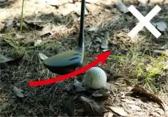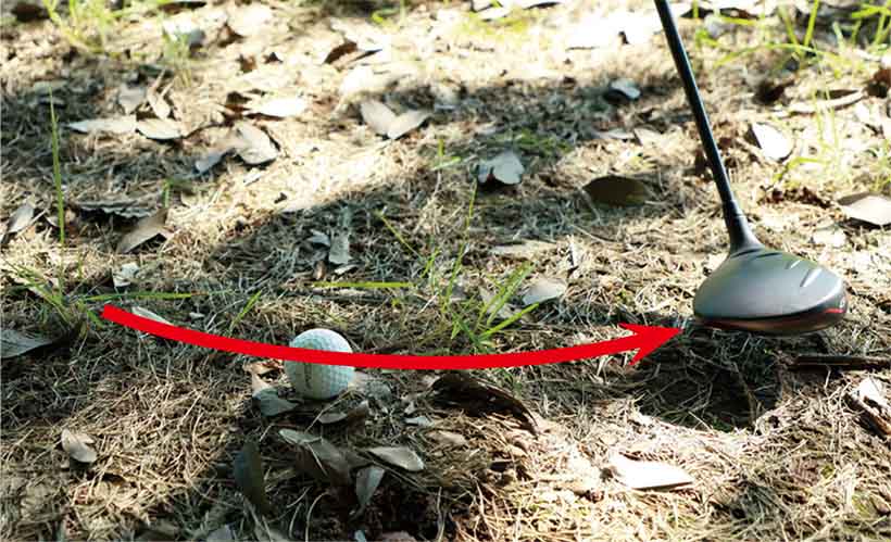 ただし林の中はボールのライが悪かったり地面が平らでなかったりするケースが多いので、フェアウェイからのショットのようにソールを滑らせる意識は持たないことです。砂が硬いバンカーと一緒で、小さい石があったりして、案外ソールが跳ね返されやすい点に注意しましょう。