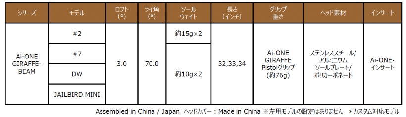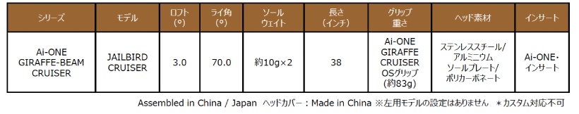 また同時に、パター長さ38インチ仕様の「Ai-ONE GIRAFFE-BEAM CRUISERパター」 も発売。ヘッドは、JAILBIRD形状1種類となっている。