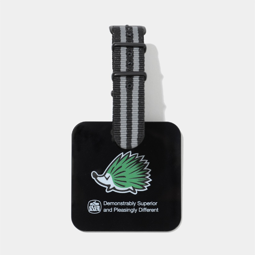 CLUBHAUS定番のNATOベルトのついたネームタグのコラボレーションバージョン。アクリル製で、ChevronWedgehogの鮮やかなグラフィックが目を引く。