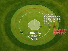 今野 まず、60cmは入る距離と捉えます。1.2m以内は平らならだいたい入ると考えてもいい距離なので、入れに行くパットを打ってもいいと考えましょう。ですが、カップまでの距離が1.5m、2m、2.5m、3mと離れれば離れるほど、カップインの確率が下がっていくので、入れる気持ちを抑えて、カップに寄せるほうに気持ちを切り替えていってください。