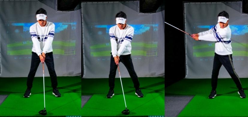 「足の裏で地面を踏むことで、クッとヒザまで力が入り、バックスイングの下半身の形が確定。『二』でクラブを上げても土台ができているからズレることもない」(内海プロ)