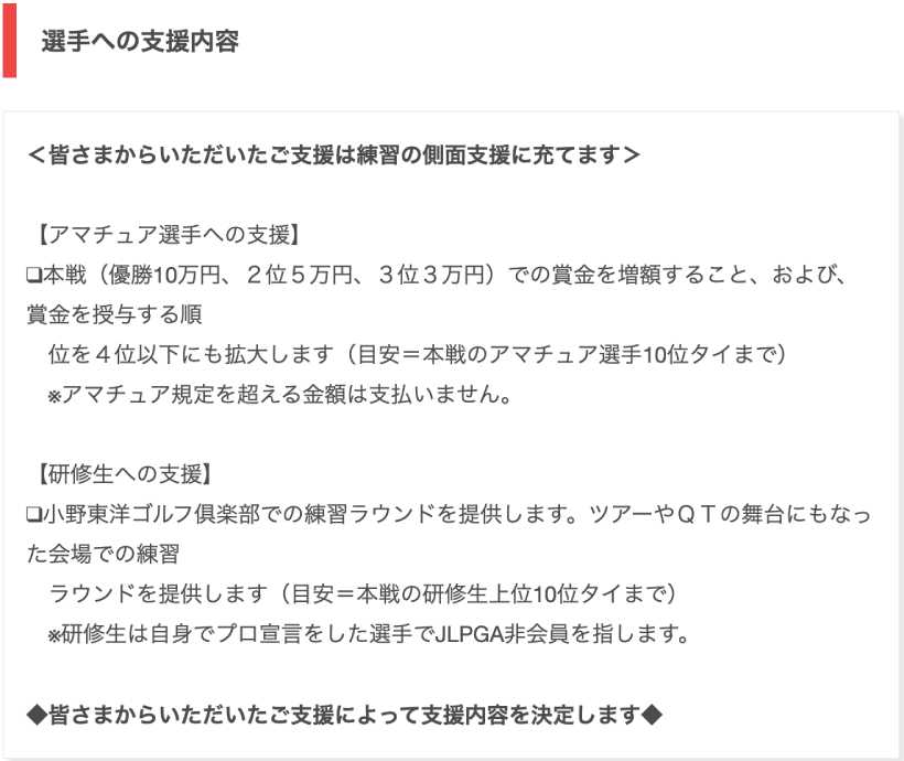 本大会に出場するアマチュア・研修生の最大の目標は「JLPGAのプロテストに合格すること」。ゴルフ競技を継続するためには練習環境を整備することが不可欠だが、試合に出るだけでも多くのお金がかかり、サポートするご家族の負担も少なくない。本大会は「ゴルフ競技の振興」「アマチュアゴルファーの育成」等を大会テーマに掲げて運営を行っている。「恵まれた環境の選手だけでなく、より多くの選手が『大きな夢』を叶えることのできる機会を提供したいと考えている。