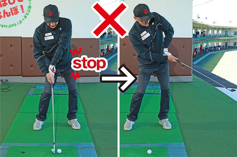 A「ハンドファーストインパクトを作るには腰の回転を止めないで打つ!」