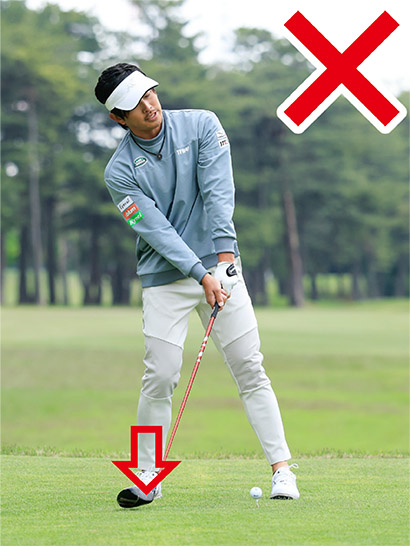 バックスイングで体重を右足に乗せようとして上体が右に流れてしまうためにダウンスイングで体重を左足に戻し切れないパターンも多いので、ここではダウンスイングで体重を左足に乗せていくことにフォーカスしてください。