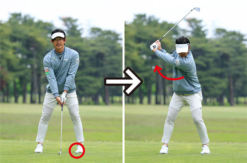通常ならボールをスタンスの中央に置きますが、ボールを左足の前に置くと切り返しの段階で体重を左足に乗せて思い切り踏み込まないとクラブヘッドがボールに届きません。バックスイングで体重を右足に乗せすぎる人は最初のうちはなかなかできないかもしれませんが、練習を繰り返すうちにナイスショットが打てるようになります。