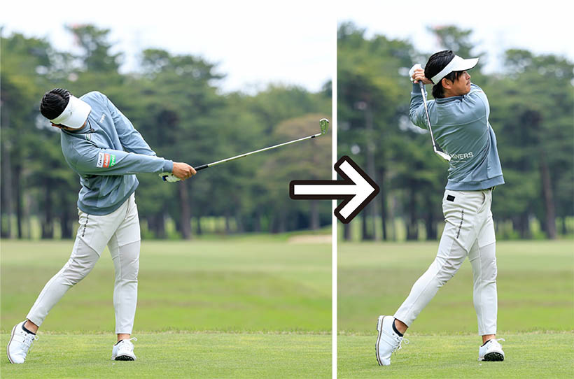腰やヒザにちょっと痛みがある人でしたら、我慢できる範囲でも構いません。下半身を無理に止めておくよりも、動かせるところはスムーズに動かしてクラブを気持ちよく振り抜くほうがカラダへの負担は少ないのです。