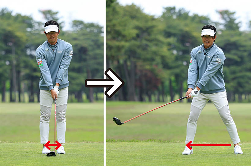 基本的な体重移動は皆さんもご存じのように、バックスイングで体重を右足に乗せて、ダウンスイング以降は体重を左足に移動させます。左右の体重移動とカラダの回転をリンクさせることでヘッドスピードがアップします。