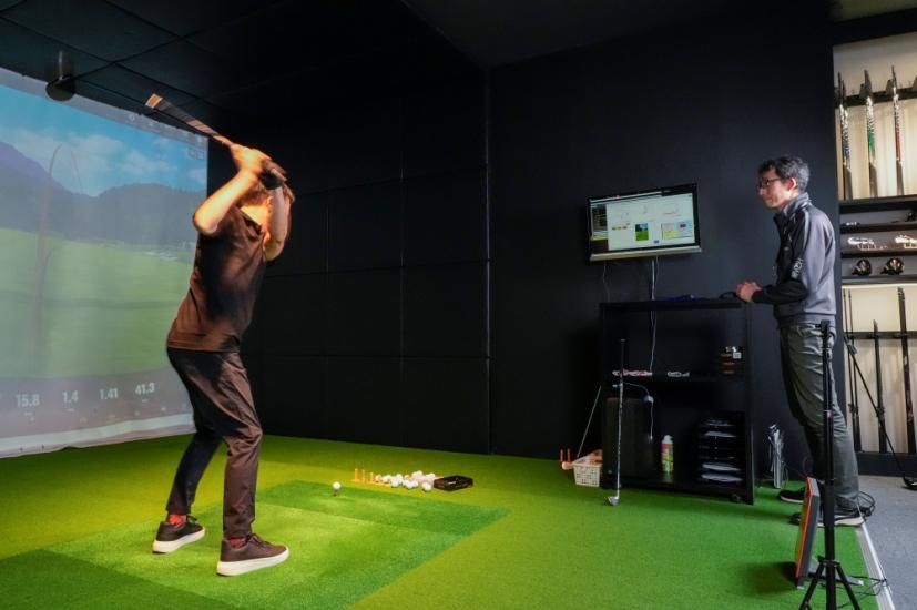 ノリオ社長、緊張しているかと思いきや、逆に自社のフィッティングシステムをじっくりと知れるチャンスと”ノリノリ”。ウォーミングアップから熱が入り、トラックマンが設置された試打室でビシバシとボールを打つ。