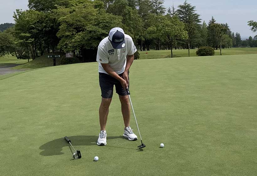 次に「Allan ZTパター」を打ちました。構えてみるとフェース面からヒールまでしっかりとサイトラインが入っています。またブラックのボディに対してシルバーのパーツがちょうどボールのサイズくらいになっているので、とても方向性が出しやすいですね。そのシルバーのパーツのせいか少しヘッドの厚みを感じます。