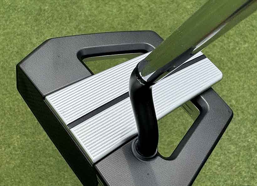 シャフトはフェース面よりも右側に向かって伸びていますが、そこからネック部分が曲がりヘッドのヒール側に挿さっています。そのためフェース面が少しシャフト軸よりも左にあるとはいえ、他のゼロトルクパターとは違い、普通のダブルベントネックなどのパターに近い感覚で構えられます。