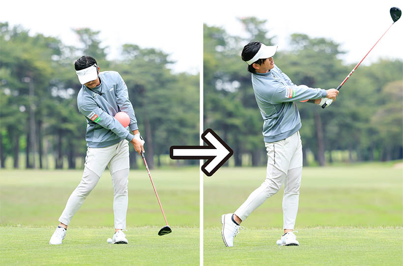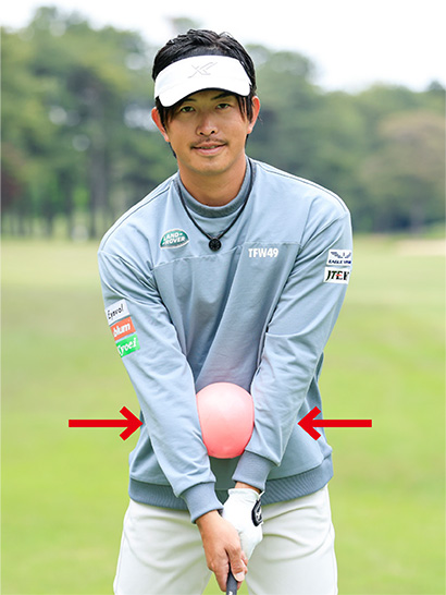 そこで練習ドリルとして両前腕部に小さめのボールなどをはさんで素振りを繰り返しましょう。ボールをつぶす感覚で強くはさまないで、ボールを落とさないくらいの圧力をかけておけば十分です。アドレス時の両肩と両腕の三角形をキープしてスイングする感覚がつかめますし、正しいアームローテーションが身につきます。スイングの途中でボールが落ちてしまうのは両ワキがあいてしまう間違った手打ちになっている証拠です。