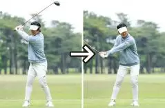 そういう人たちは手首を固めてしまう傾向が見られます。両手をガチガチに握るために手首が硬くなり、手打ちスイングもカラダ打ちのスイングもできていないのです。グリップを柔らかく握るということではなく、クラブがスムーズに振れるように手首を柔らかく使うことが大事です。胸の前でクラブを持ち、クラブヘッド側をグルグル回せるような握り加減と手首使いのバランスを体感してください。