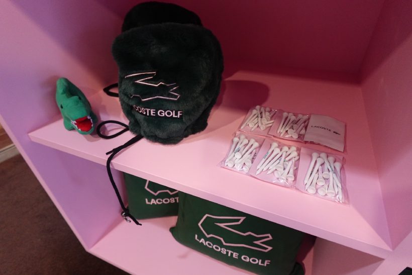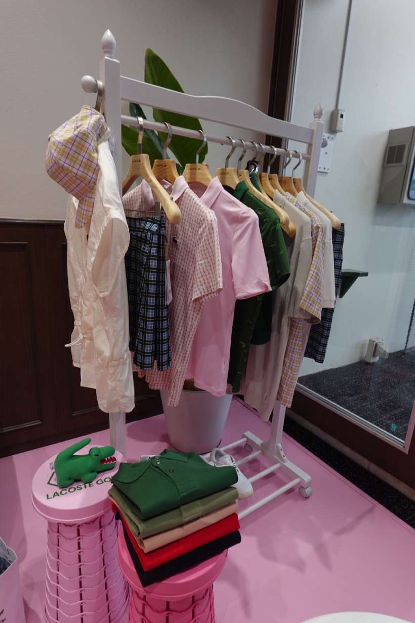 グリーンとピンクが特徴的な、ラコステらしい洗練された空間にて、ゴルフコレクションの展示ほか、コブラゴルフの新作ウェッジを含む最新クラブの試打体験が可能となっている。また、ラコステオリジナルステッカーがもらえるかも★