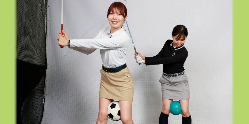 (写真左)アドレスからテークバックまでボールを挟んでいても……(写真右)途中で内転筋やお腹周りの力が抜けるとボールは落ちてしまう!