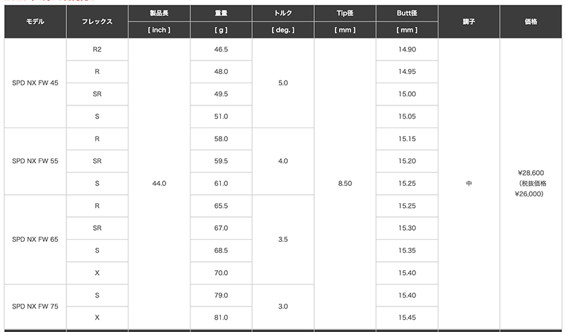 「SPEEDER NX FW」はラインナップも豊富。40g台の「45 R2」から「75 X」(81g)まで13種類のフレックスが用意されているので、自分のドライバーの重量やヘッドスピードに合わせて選ぶことができます。